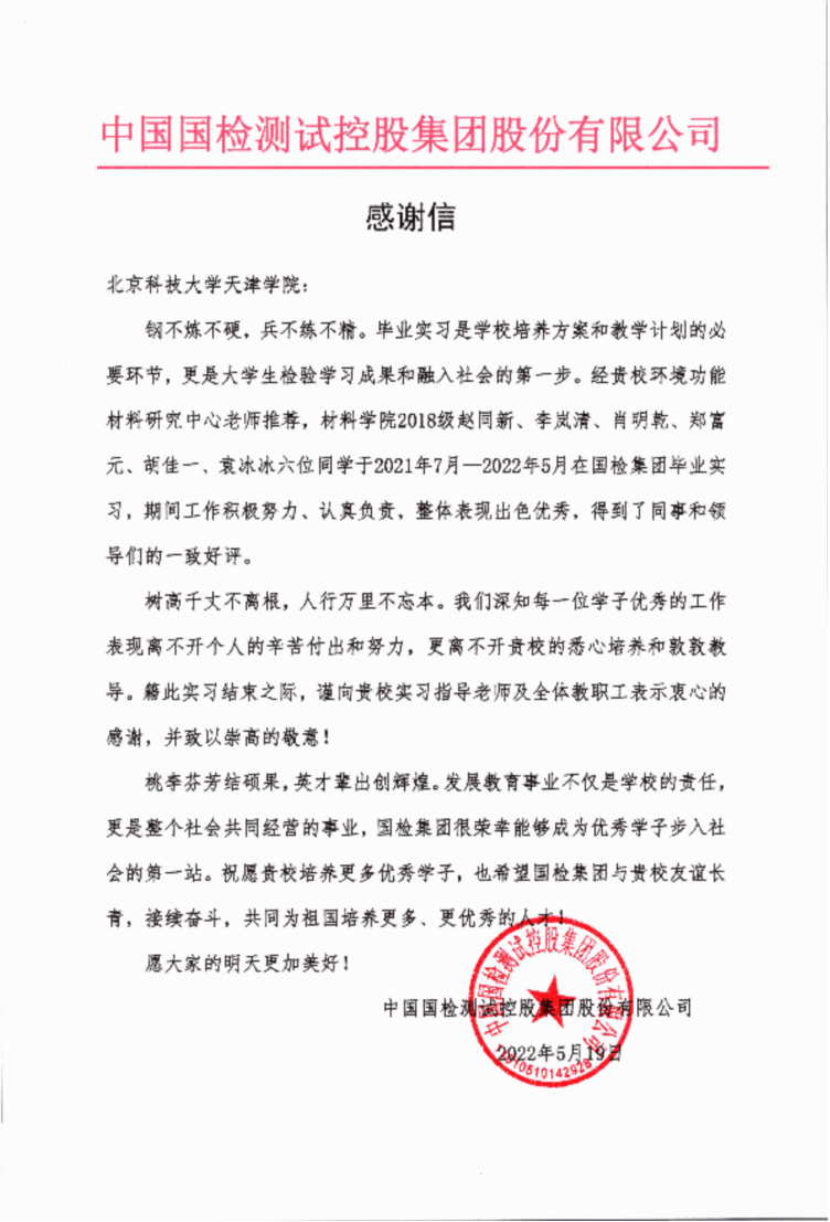 5月19日,我院收到来自中国国检测试控股集团股份有限公司(国检集团)的感谢信,信中对我院材料系六名在该集团参加毕业实习学生的优秀表现给予了高度评价,对学院的应用型人才培养模式给予了积极肯定,对学院老师们表达了感谢和认可。