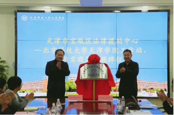 高万通局长和丁煦生院长共同为“天津市宝坻区司法局法律援助中心-北京科技大学天津学院工作站”、“北京科技大学天津学院教学实践基地”揭牌。