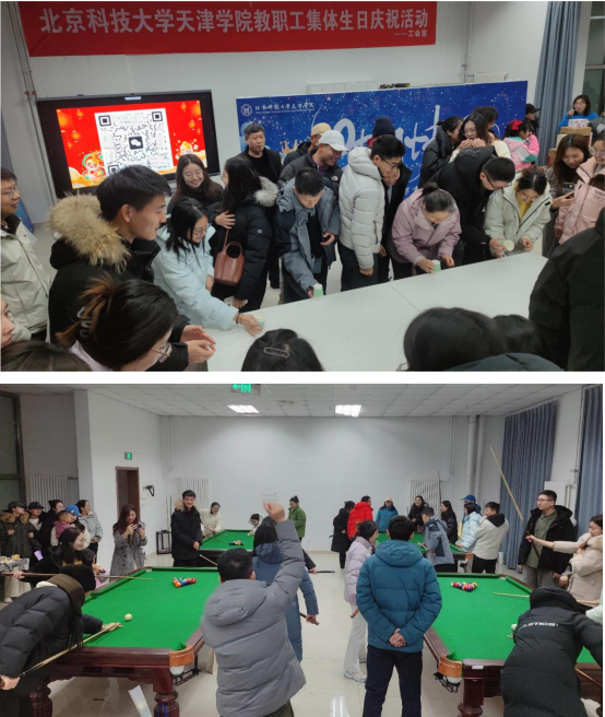 生日会上,来自各个部门的教职工共唱生日祝福歌曲,品尝蛋糕,深入交流工作与生活中的心得和感悟。此次集体生日活动设置的游戏环节将生日会的气氛推向了高潮,老师们踊跃参与学院概况有奖问答、表情包猜美食、“翻杯子”接力赛和趣味台球团体赛,队员们配合默契,精彩的表现点燃了赛场气氛,助威呐喊声、掌声不断。