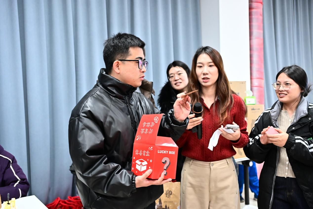 随后,抽奖游戏拉开帷幕,现场气氛升至高潮。工会准备了印着幸运数字的抽奖券,中奖教师惊喜欢呼举手示意,接过“冬日暖心礼”,掌声不断。接下来的“幸运传递”互动环节中,又有不少老师收获了惊喜奖品,整个“家园”里都洋溢着欢声笑语,暖意融融。