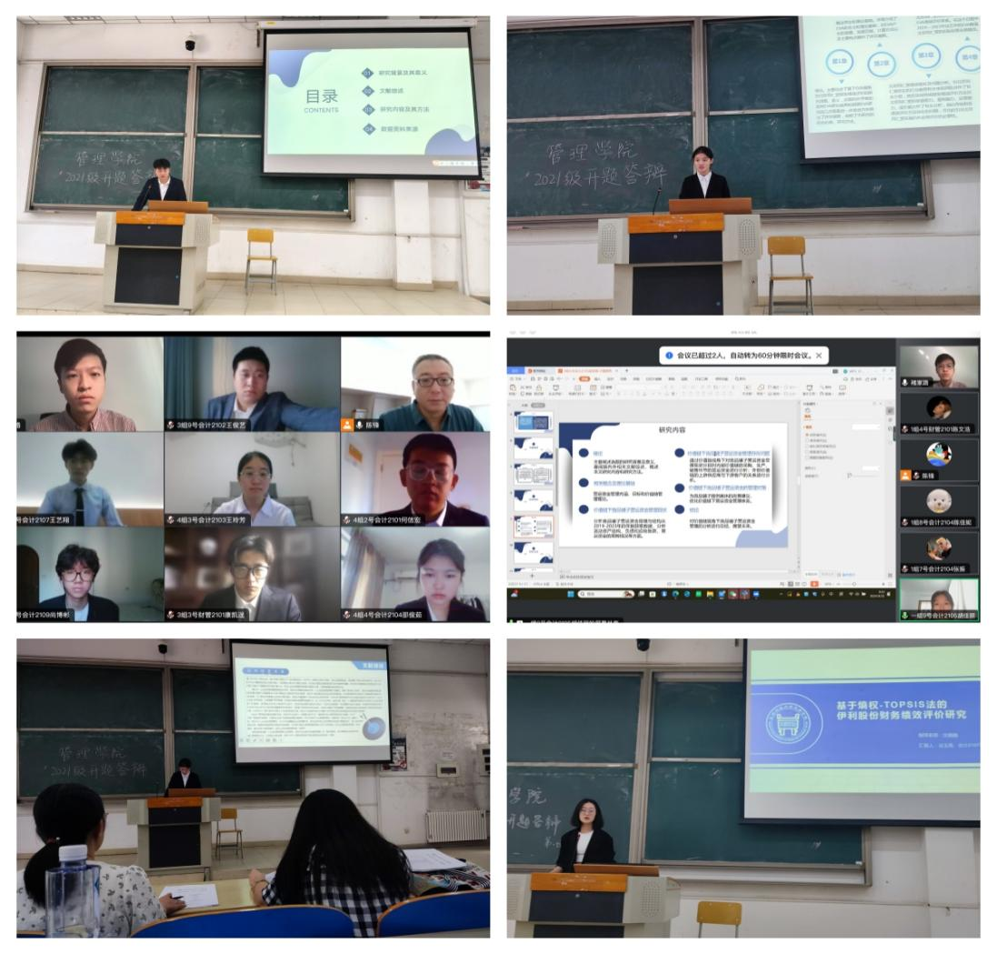 答辩中,同学们分别就选题背景、意义及依据,研究目标、研究内容、研究方法、进度安排等方面进行了详细认真地阐述和说明。开题评议小组教师根据学生的汇报情况,指出了开题答辩中存在问题,对选题背景及意义、研究思路、研究内容和方法均给出了中肯的建议和意见,指出同学们在开题报告撰写当中的存在问题并提出了下一阶段的任务和要求。同时,管理学院对于论文选题不成熟及论文写作质量较差的学生分不同答辩小组进行二次答辩,意在通过二次答辩与指导教师共同形成教育合力对学生的论文写作工作进行再督促及有效改进。