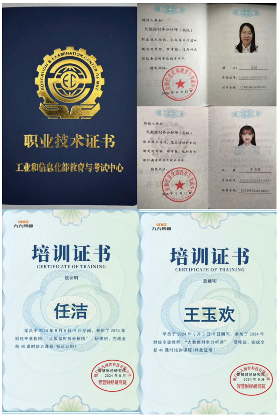 在培训过程中,管理学院十分注重对青年教师的培养,着力为青年教师深度拓展各种培训平台,不断给予系统培训机会,帮助青年教师专业成长,教师们在培训期间也收获颇丰。今年暑假管理学院任洁老师和王玉欢老师依托财务报表一流课程建设,参加了厦门九九网智科技有限公司组织的大数据财务管理和分析教学云平台相关实训,并通过考核,获得培训证书。随着数字化技术和智能化技术的快速发展,相关技术已经广泛运用于会计信息处理、财务报告编制、审计和税务等方面,此次培训结合大数据分析技术,对大规模财务数据进行数据清洗、转换和详细分析,最终实现数据可视化功能,能够满足我院专业课程和教师技能发展需求,良好提升教师数字化技能。由于我院王玉欢老师在此培训中表现突出,并在最终考核时取得优异成绩,九九网智科技有限公司特地向该教师发出邀请,担任兼职讲师,最终王玉欢老师获得兼职讲师聘书。