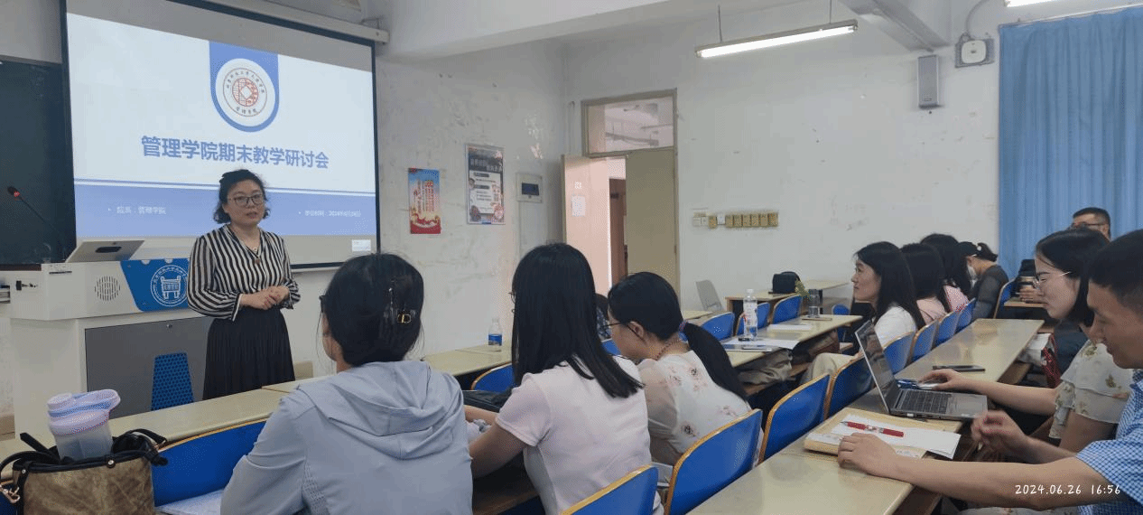 在新时代、新商科的背景下,为更好地提升应用型管理人才的培养质量,2024年6月27日管理学院在8教102开展了期末教学研讨会,由管理学院副院长王晓欣老师主持。管理学院常务副院长王宾容老师以及管理学院教师参加了此次会议。