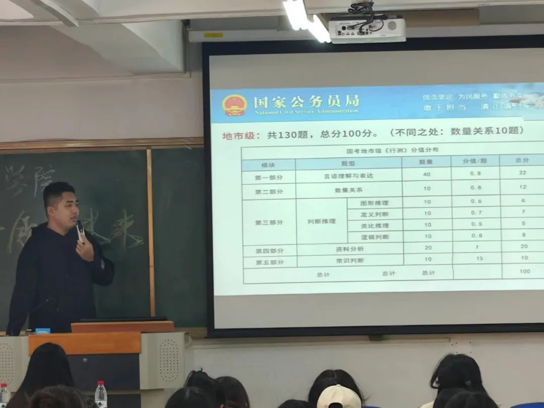 崔烜硕学长首先对职业类型和就业政策等进行了讲解,让学生们对职业规划有了初步的了解,随后,崔烜硕学长结合自身经历分享了公职部门单位具体招聘要求与关键时间点,各类招考的上岸技巧与面试心得,帮助同学们打破信息壁垒,进一步了解各类单位招聘与考试渠道,为未来拓宽选择。