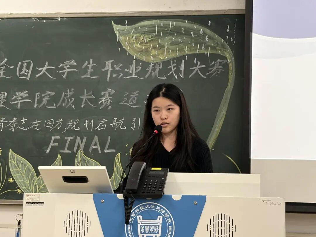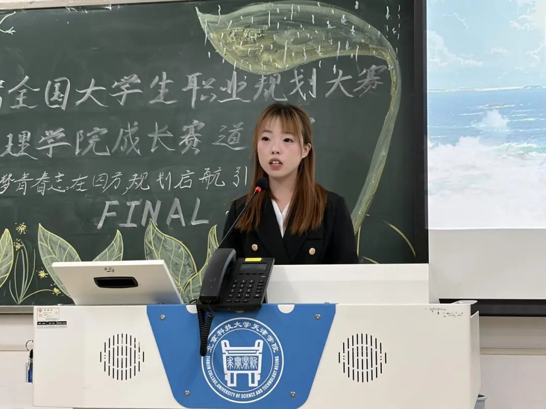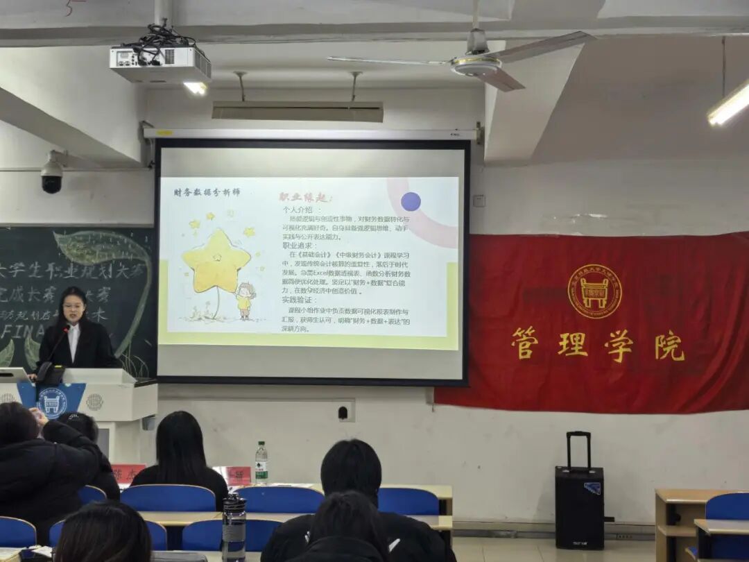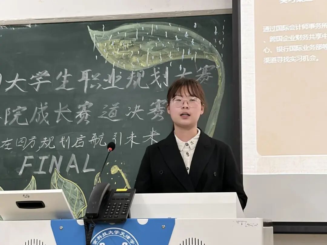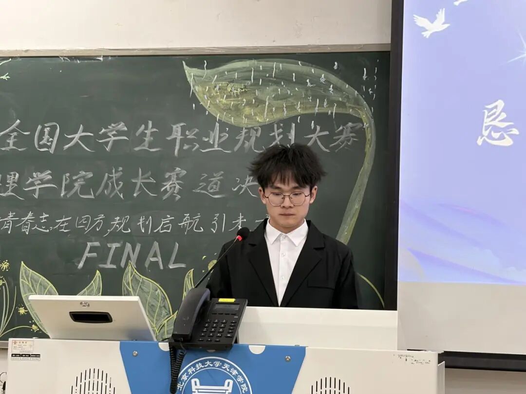 比赛现场,参赛选手通过PPT演讲的形式展示个人的风采,从自我认知、职业环境分析、职业目标确定、行动成果、评估与调整等方面,全面展示自己的职业规划,现场选手们富有感染力的表现赢得了观众的阵阵掌声。