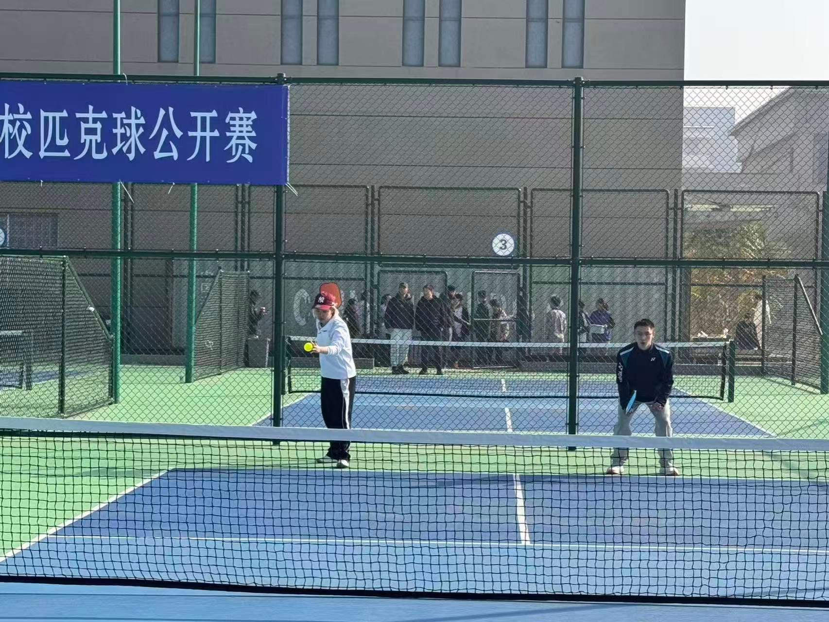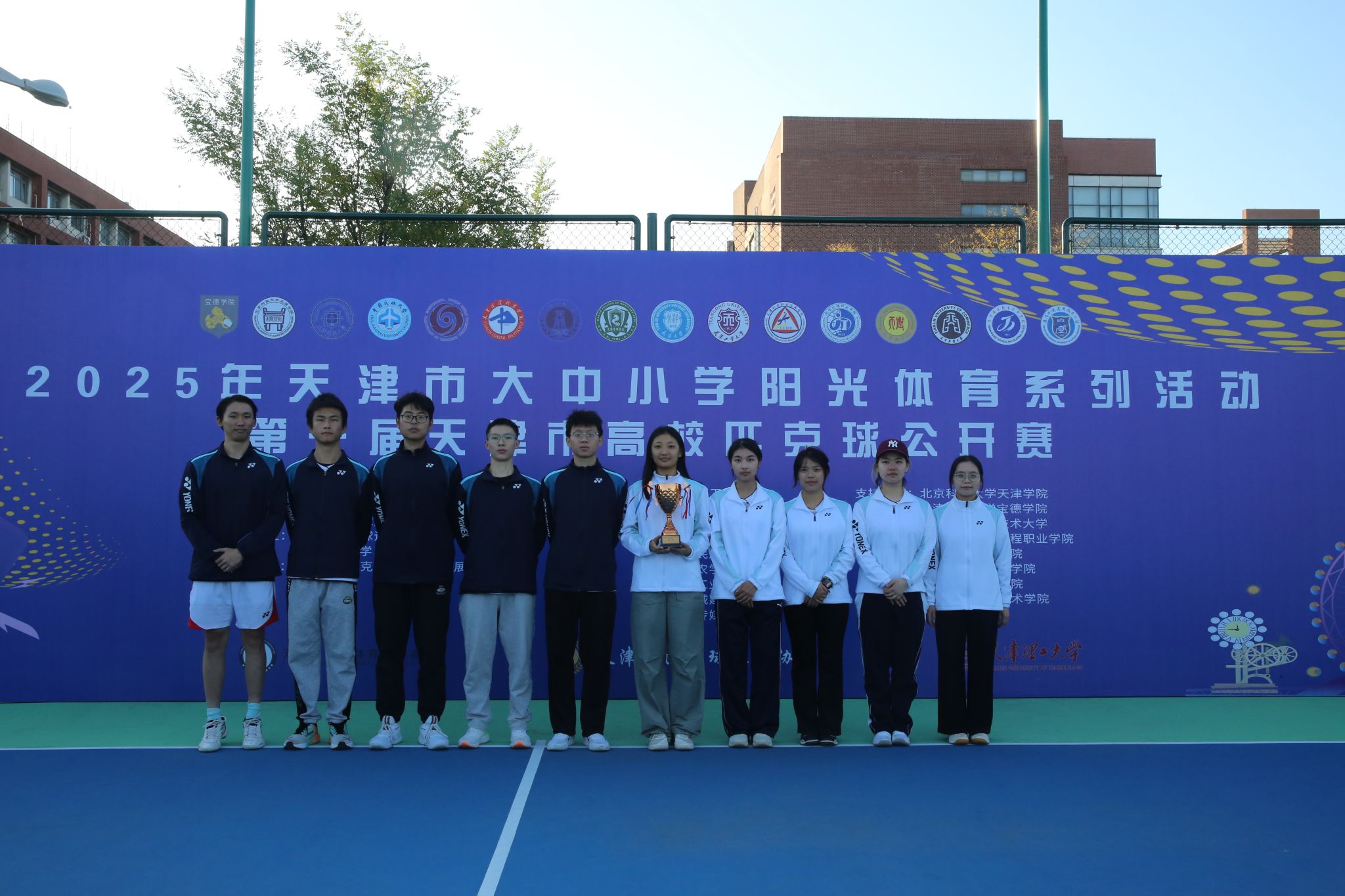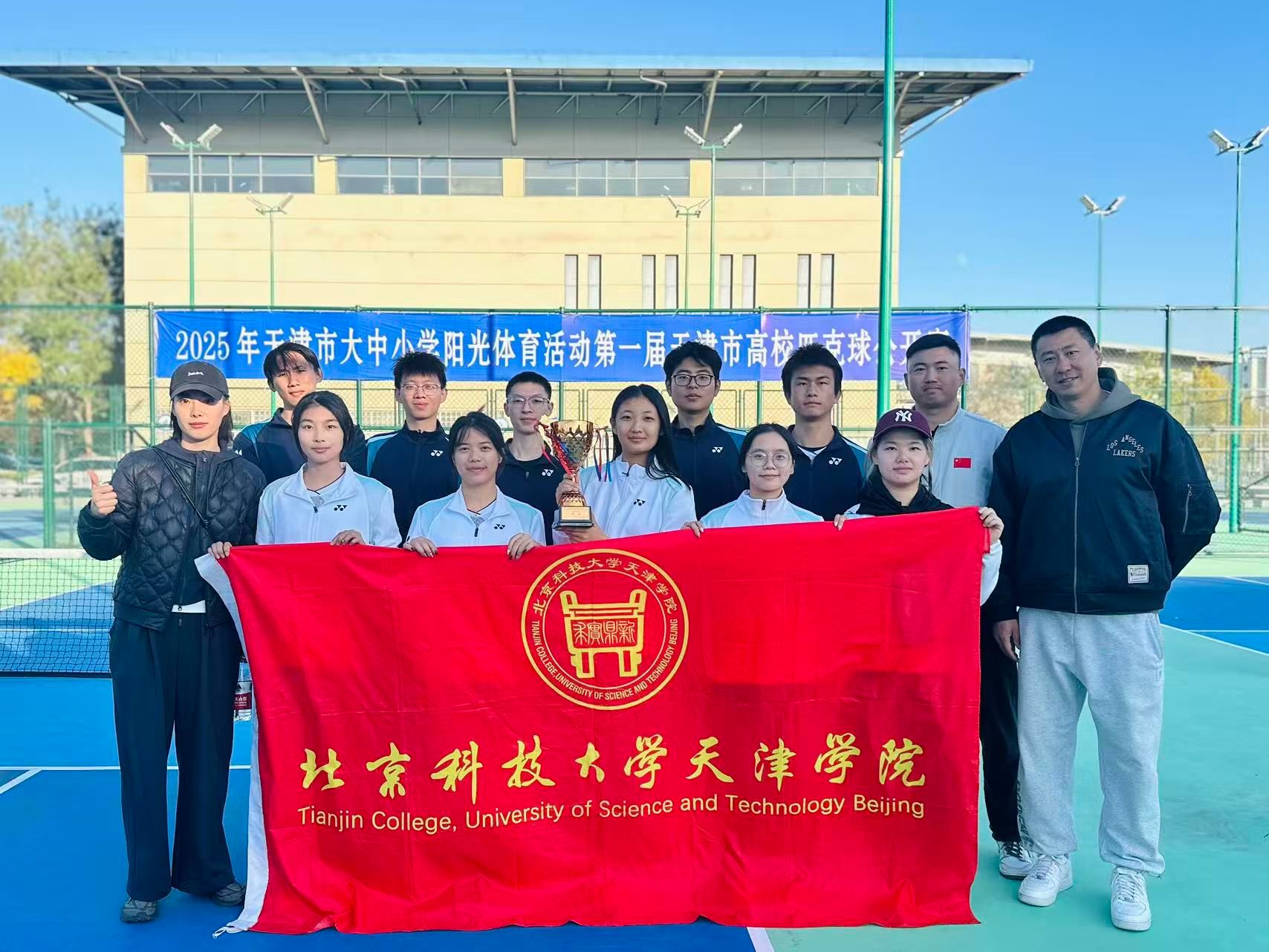 2025年11月1日,由天津市教育委员会、天津市学生体育联合会和天津市匹克球运动协会共同举办的2025年第一届天津市高校匹克球公开赛在天津理工大学匹克球场激烈开打,本次赛事吸引了全市17所高校,共计200余名运动员、教练员和领队踊跃参与。我院由体育部赵文男、杨永康、程旸三位老师任教练员和10名球员组队参赛,经过激烈角逐,我校匹克球队获得天津市高校团体第三名(季军)。