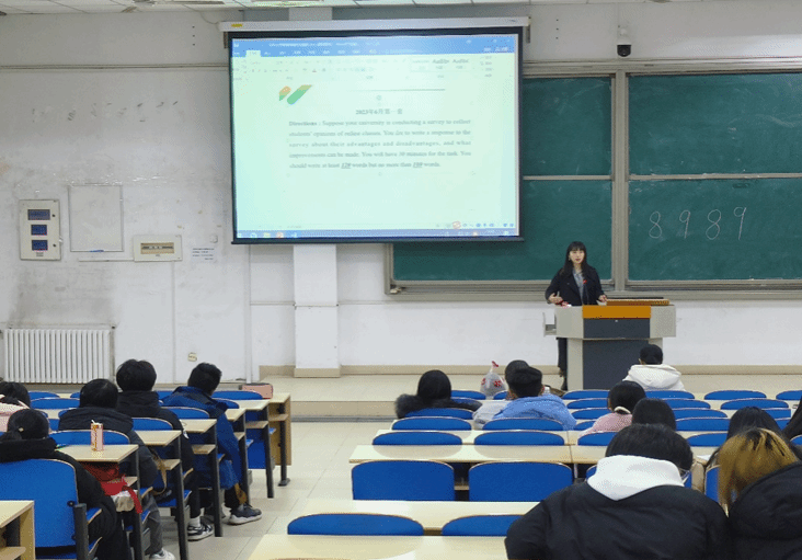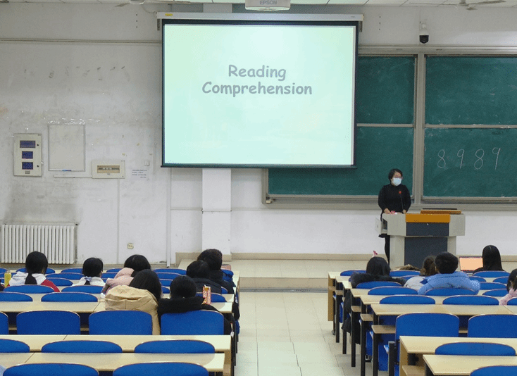 张绚老师首先介绍了阅读的三个题型的特点,指出四级阅读理解分为词汇理解、长篇阅读和仔细阅读,其中仔细阅读的分值占比最高,建议学生备考时分清主次。在答题过程中注意详略得当,根据题目的“题眼”快递在文章中找到答案最为关键,并总结出四条解题方法:顺序原则、同义原则、归纳原则、排除法。随后张老师从翻译题型、翻译话题以及翻译技巧几个方面对四级考试中的翻译部分进行了详细的说明。她指出翻译内容通常涉及到我国历史、文化、经济、社会发展等题材,考生应对其基础知识有一定的了解和掌握,如遇到不会翻译词语,可以根据上下文和词性推测其含义。受考试时间限制,张老师建议考生先快速浏览全文,理解大意后再进行翻译,避免因为对文章内容理解不足而导致的翻译错误。最后,张老师强调翻译一定不能留到最后再做,要把握好时间分配。