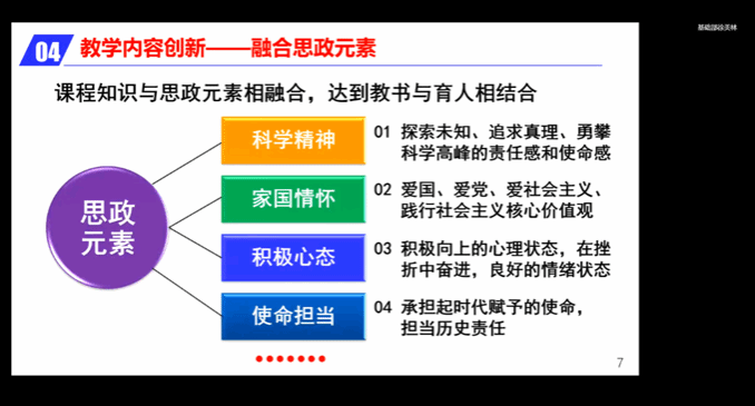 徐老师以“教学实践中的教学创新”为主题,从“为什么要进行教学创新”引出共同思考,抛出“什么是教学创新”“如何进行教学创新”的核心问题,通过“教学内容创新”“教学方法创新”“教学手段创新”“教学考评创新”四个方面,以高等数学课程为实例,图文结合,详实生动的分享教学创新途径及方法,保证教学活动的高质量有效地进行。