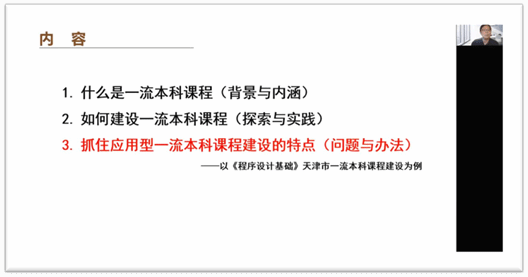 本期讲座采取线上直播形式,由北京科技大学天津学院信息工程学院教学副院长于静老师主讲。于静老师作为天津学院第一批入职教师,亲身经历了学院课程建设的各个发展阶段。根据《教育部关于一流本科课程建设的实施意见》(2019年10月)提出的“依据高校办学定位和人才培养目标定位,建设适应创新型、复合型、应用型人才培养需要的一流本科课程,实现不同类型高校一流本科课程建设全覆盖”的精神,天津学院积极布局和落实,于静老师紧紧围绕我院人才培养目标的定位,构建教学团队,凝练已有成果,承担并完成了天津市级一流课程建设项目。讲座中于静老师结合工程教育认证核心理念,以“面向应用型人才培养的一流本科课程建设思考”为主题,深入实际重点解读了基于应用型本科课程特点的一流课程建设指标体系和建设路径,以天津市一流本科课程《程序设计基础》建设为例,分享了贯穿课程建设全过程的先进的教育教学理念、突出创新性的解决方案以及增加挑战度的实践经验与感悟。