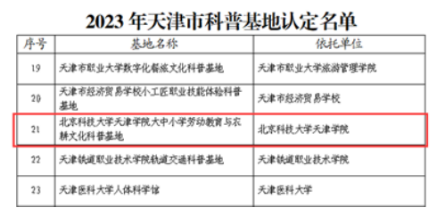 近日,天津市科技局公布了2023年度天津市科普基地名单,我院依托劳动基地申报的“北京科技大学天津学院大中小学劳动教育与农耕文化科普基地”成功入选。本年度市科技局、市教委、市科协对140家申报单位进行了形式审查、材料评审、集中答辩、实地勘察、部门评议,并经市科技局局长办公会审议、网上公示等环节,最终认定58家单位为2023年天津市科普基地。