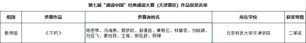 近日,第七届中华经典诵写讲大赛“诵读中国”经典诵读大赛获奖名单公布,我院参赛作品在本届竞赛中分别荣获天津赛区教师组二等奖1项,大学生组三等奖2项。