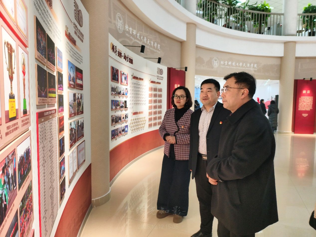 活动伊始,双方在理工馆209会议室举行座谈,围绕“共建共享促融合•双高共进谋发展”主题展开深入交流。我院副院长刘晓明致欢迎辞,对天津科技大学图书馆同仁的到来表示热烈欢迎。他指出,天津科技大学图书馆在党建引领、智慧化转型、资源建设、文化育人及学科服务等诸多领域的创新实践与专业精神,为我院图书馆提供了宝贵经验。时值我院建院二十周年,我馆正处于深化建设、开拓发展、转型升级的关键时期,期待双方以支部共建为纽带,在资源共建共享、服务效能提升、学术创新协同等方面开展更加务实而深入的合作,共同探索新时代高校图书馆高质量发展的新路径。
