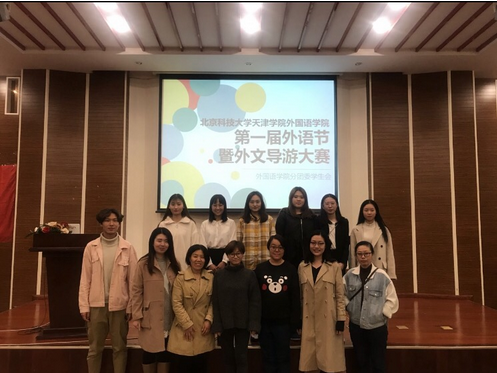 另外,为了加强英语专业学生对专业知识的理解,锻炼学生的口才及表达能力,北京科技大学天津学院外国语学院2019年度外文导游大赛作为外语节第一个活动也在当天拉开序幕。此次决赛邀请的评委老师有:外国语学院党总支书记张莉、党总支副书记张添善、分团委书记李萌,教师张绚、安传达、张晓宇、孙影、17级辅导员杨艳秋。