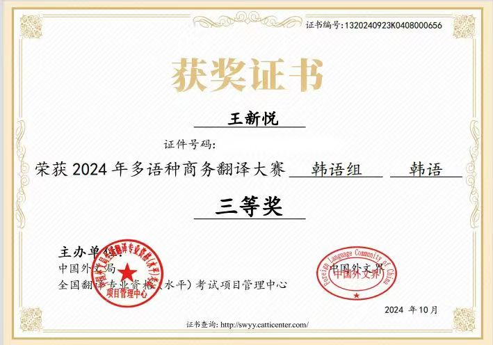 2024年9月28日至9月29日,由中国外文局和全国翻译专业资格水平考试项目管理中心联合主办了2024年全国多语种商务翻译大赛,我校朝鲜语专业2201班的王新悦同学在此次大赛中表现出色,荣获韩语组三等奖,为我校赢得了荣誉,这也是我院朝鲜语专业第一次获得全国性外语类专业奖项。