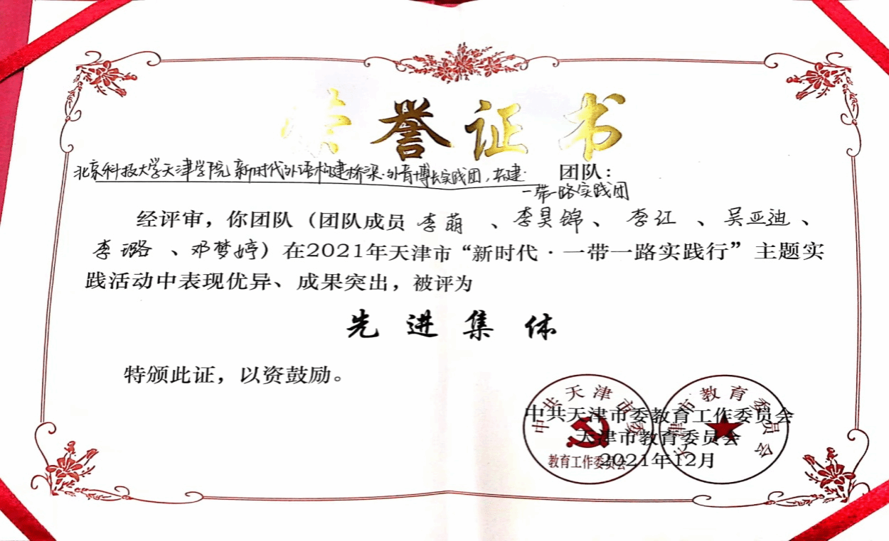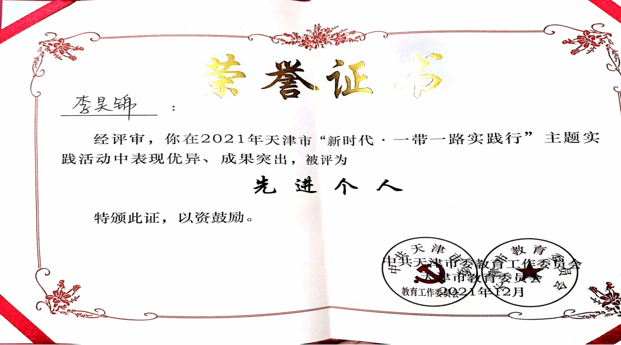 近日,我校在市教育两委组织开展的“新时代·实践行”系列实践活动中喜获佳绩,由外国语学院组建的“新时代外语构建桥梁·外音博长”实践团在一带一路项目中荣获2021年天津市“新时代•一带一路实践行”先进集体称号;实践团成员李昊锦表现突出荣获“先进个人”称号。