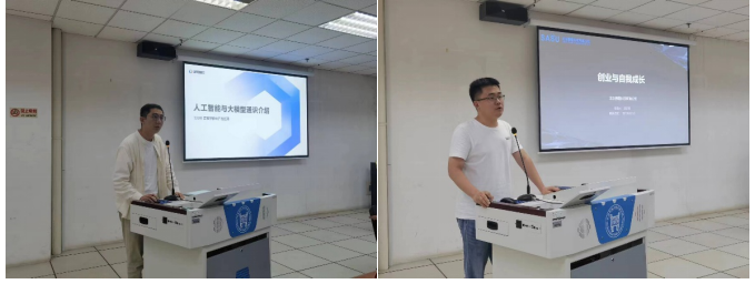 本次活动的第二个阶段,是工作室首场主题学习专题讲座。首先,百度智能云产品经理王仰令以《人工智能与大模型通识介绍》为主题进行了专题报告,报告以当前爆火的AIGC为切入点,主要介绍人工智能与大模型的关系以及百度智能云千帆大模型的实际应用场景。随后,北京赛曙科技有限公司总经理王洪阳以《创新创业与自我成长》为题,讲述其自身的创新创业经历,鼓励同学们要敢于展现自我,对所选择的事情保持热情、坚持不懈。