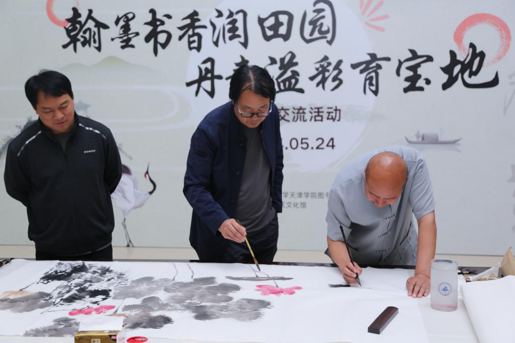 为了弘扬中华优秀传统文化,营造热爱国粹、热爱书画艺术的氛围,更好地推动校园文化建设,图书馆联合学院工会、宝坻区文化馆于5月24日下午在社科馆举办“翰墨书香润田园 丹青溢彩育宝地”书画交流活动。宝坻区文化和旅游局副局长张英、北京科技大学天津学院副院长兼财务总监王俊敏、北京科技大学天津学院党委副书记、工会主席郭雅娟、宝坻区文化馆馆长倪芳芳、宝坻区的书画家、文化馆工作人员、图书馆全体馆员以及学院书画爱好者200余人参加了活动。