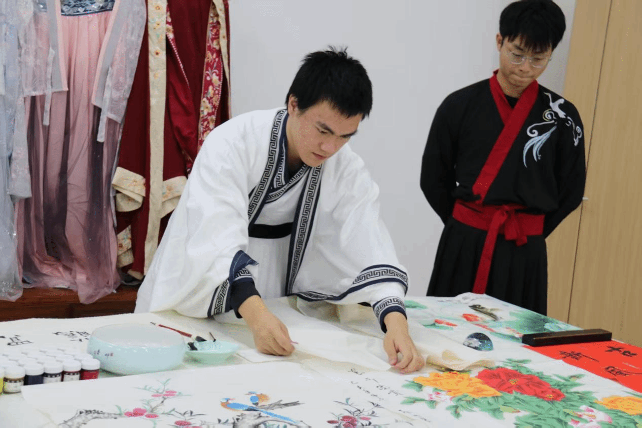 身着传统汉服的学子正执笔挥毫,在宣纸上勾勒出国风画卷,身旁同袍驻足凝望,共赏笔墨间的东方意韵。这是贝壳青年艺术节里的传统文化体验现场,从汉服礼仪到书画研习,师生们在沉浸式体验中触摸中华文脉,让千年雅韵在校园里焕发新生。