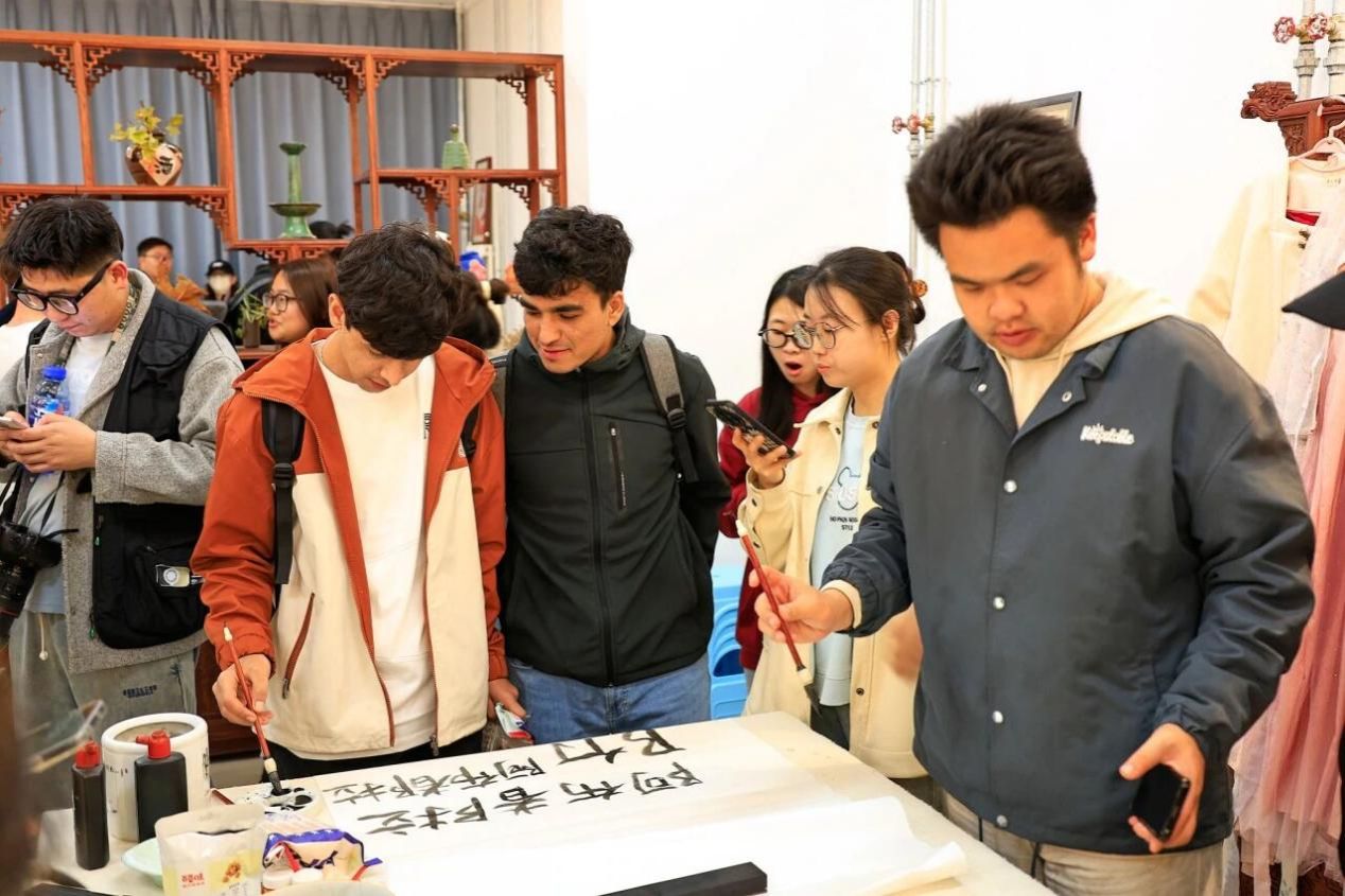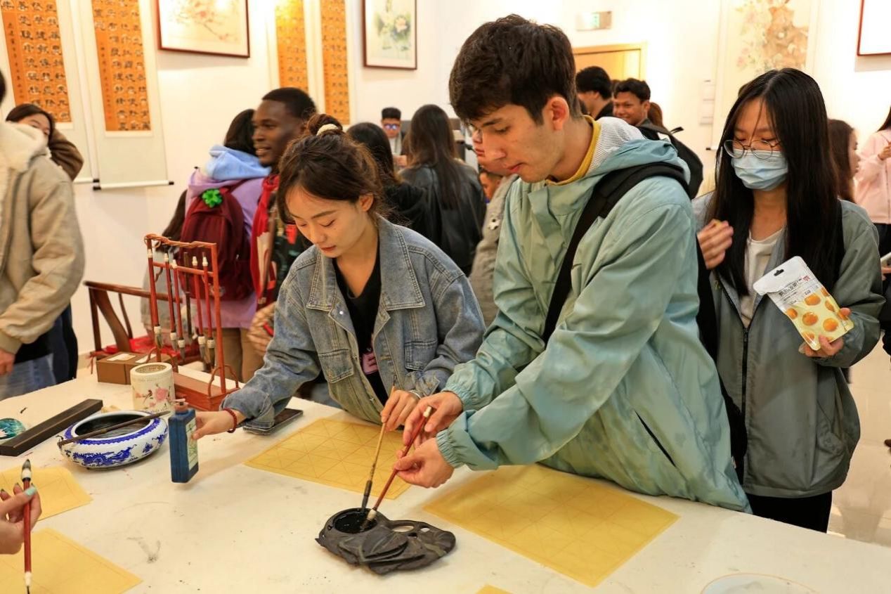 而书法体验环节更是将活动气氛推向了高潮。当毛笔与宣纸轻轻触碰,留学生们的眼神中满是认真与执着。尽管他们对笔法的掌握还稍显生疏,但这丝毫不影响他们对书法的热情。一横一竖,书写着他们对中国文字的好奇;一撇一捺,勾勒出他们对中国文化的向往。在墨香的氤氲中,他们触摸到了中国文字独特的韵味,也体会到了中国传统文化那深厚而博大的内涵。