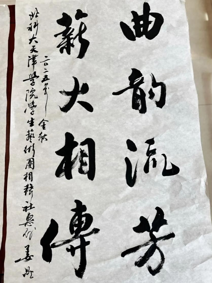 展演期间,世界说唱艺术联盟主席、马季艺术研究会会长姜昆先生亲临我校传统文化体验馆,学生艺术团茶筵社负责接待工作,姜昆先生为学生艺术团相声社题写"曲韵流芳,薪火相传"八字墨宝。这既是对相声社以往成绩的肯定,也是对未来发展的殷切期望。