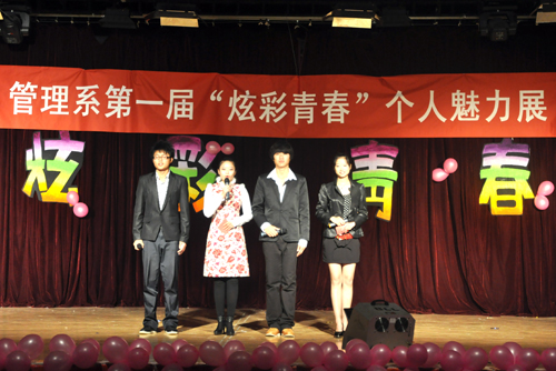 管理系第一届“炫彩青春”个人魅力展由管理系分团委策划,系学生会具体承办。本次活动面向管理系全体学生,同学们踊跃报名、积极参加,经过节目初审、二审最终进入彩排和正式演出的主要是以管理系09级、10级的同学们为主。晚会节目包含了独唱(通俗、说唱)、对唱、小合唱、独舞、歌伴舞、街舞、健美操、民乐合奏、乐队演奏、小品等多种形式。