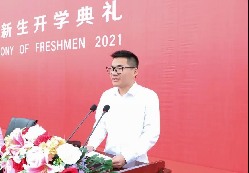 杨婷亦同学代表2021级新生发言,她号召全体新同学要把握大学四年时光,找准“小目标”,做好“大规划”,树立远大的理想信念,勇担时代重任,秉承“明德励学、效实致新”的校训精神,奋斗青春,报效祖国!